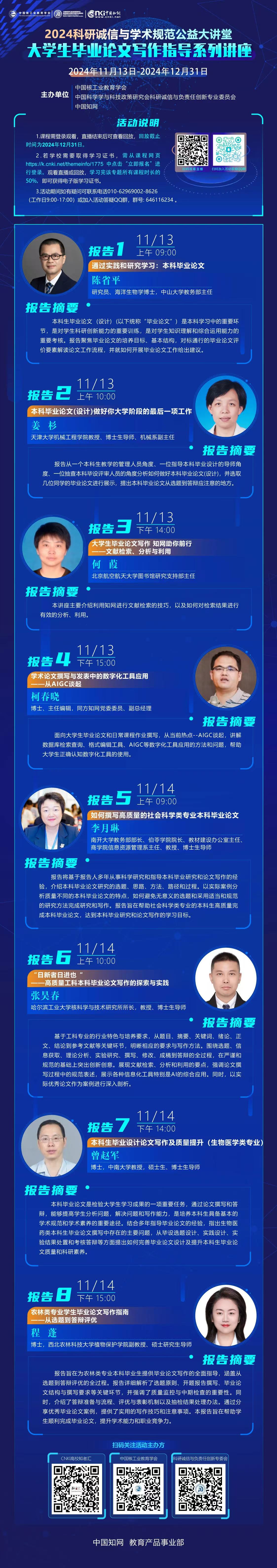 为深入贯彻落实国家关于加强科研诚信与作风学风建设的相关要求,营造求真务实的学术氛围和科研环境,弘扬诚信文化,树立良好学风,中国知网特联合中国核工业教育学会、中国科学学与科技政策研究会科研诚信与负责任创新专业委员会共同组织“2024科研诚信与学术规范公益大讲堂——老员工毕业论文写作指导系列讲座的通知”线上讲座活动。讲座内容涵盖涵盖毕业论文(设计)的培养目标、基本结构、工作流程的介绍,文献检索、分析和利用,论文撰写过程中各种信息化工具的应用等,并邀请文科类、工科类、医学类、农林类专业优秀指导老师讲解毕业论文(设计)的写作经验。