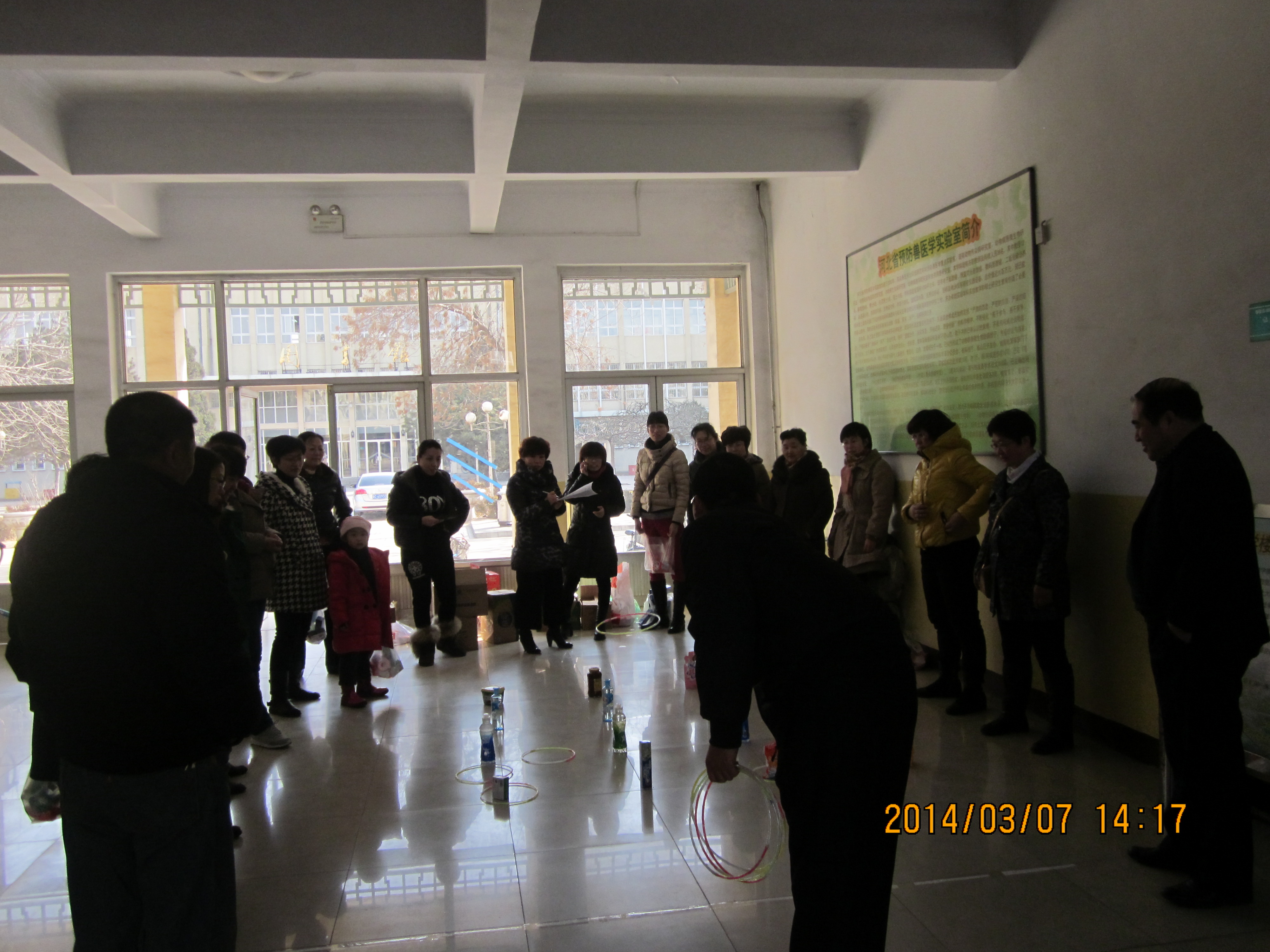 2014年3月7日304永利集团官网入口在动科楼一楼大厅举办了庆三八趣味套圈活动。本次套圈活动给每个教职工发放套圈的圈10个,站在套圈起止线外套,套中哪排奖品就到领奖处领取哪个等次的奖品,奖品共分为类,第一排的价值最低,难度也最低,离着起止线最近,以此类推最后一排离着起止线最远,奖品价值也最高。男教工在本次活动中参与的积极性也较高,他们的起止线比女教工远了一些,但是命中大奖率还是比较高,大家在套圈的过程中时不时发出开心得笑声,套不住的给予鼓励,套进大奖时大家齐鼓掌庆祝,气氛十分热烈,大家都开开心的度过这个三八节日,每人得到的奖品也非常丰厚,最多的能命中7圈,收获不小。