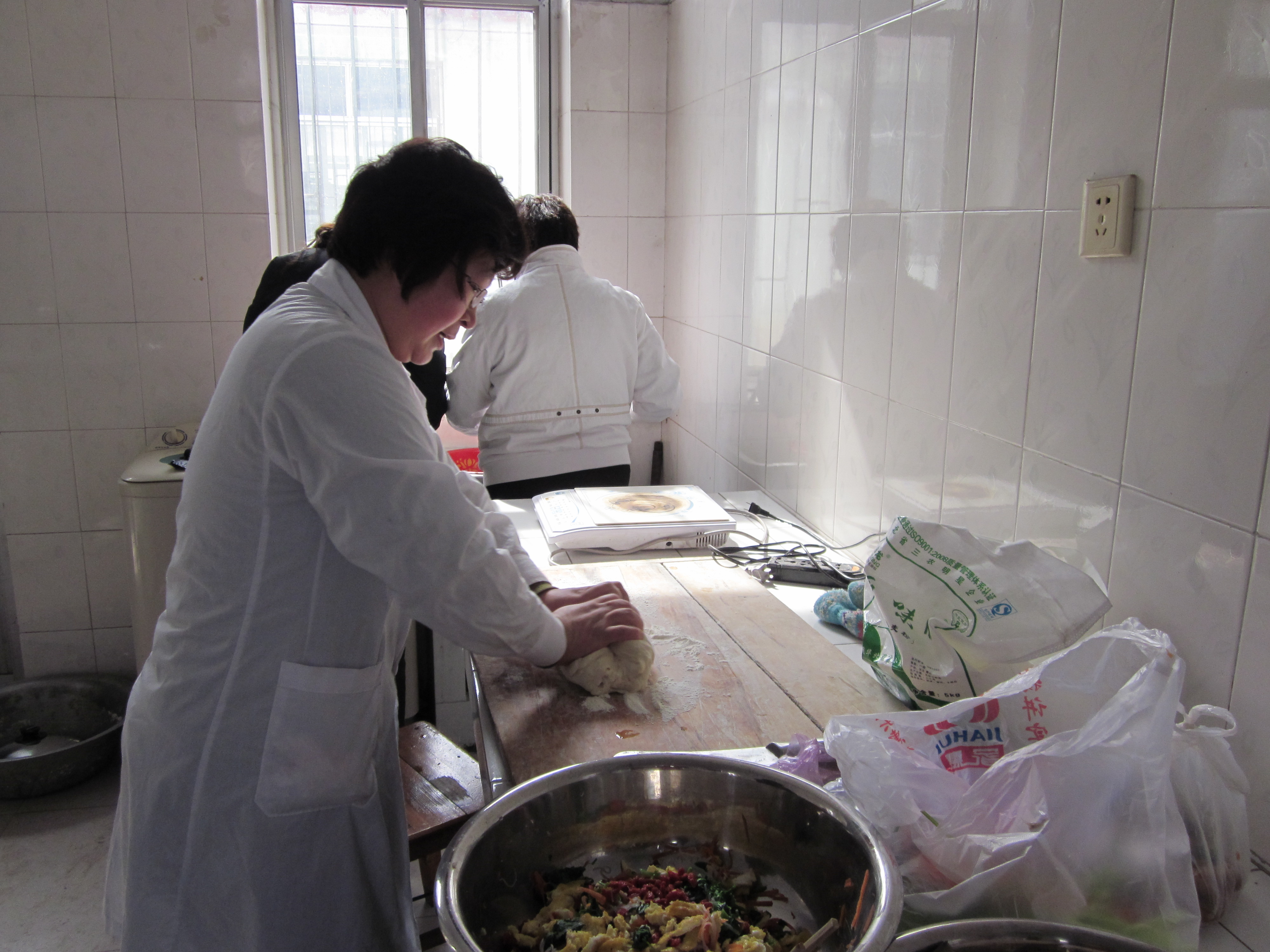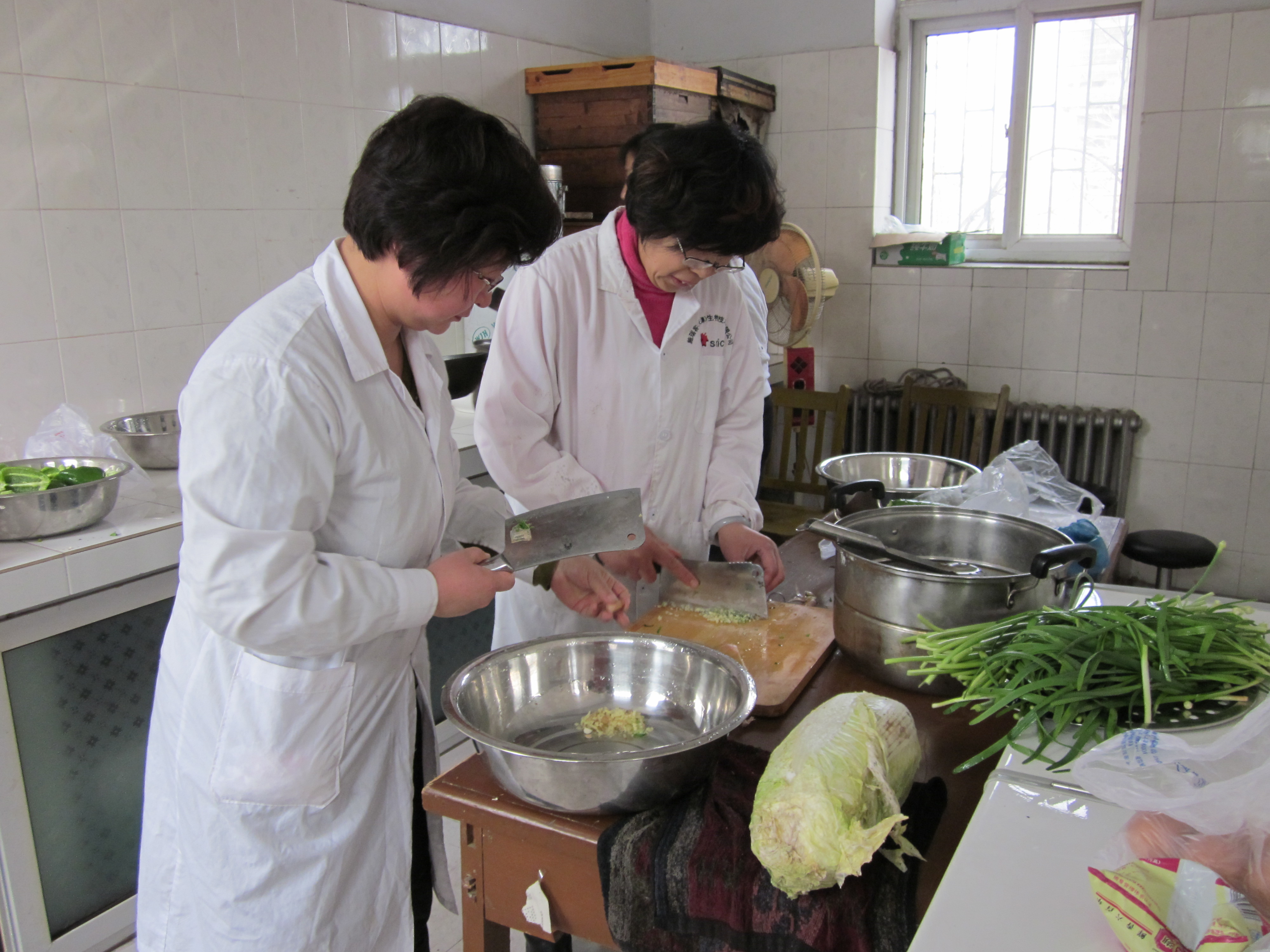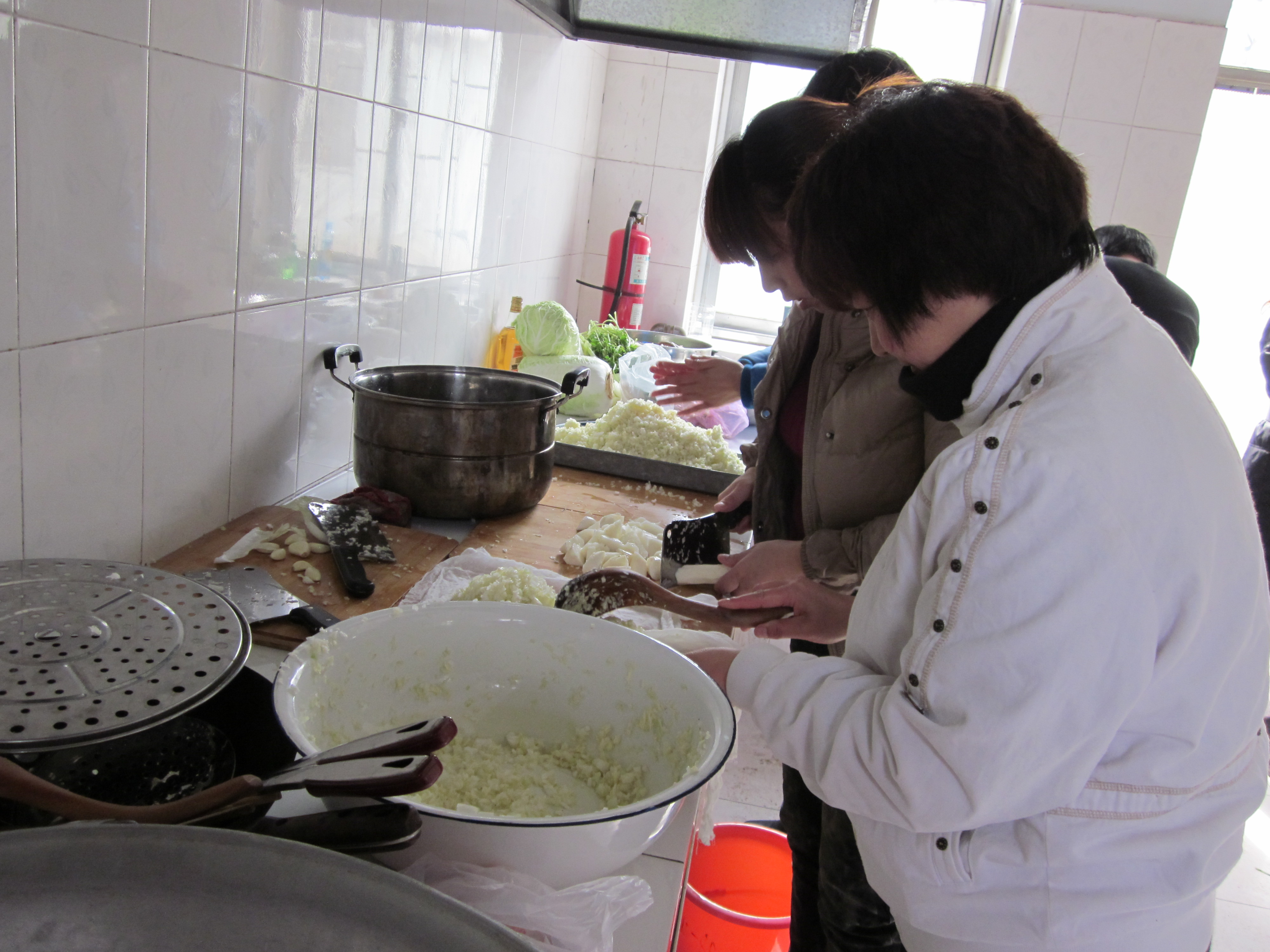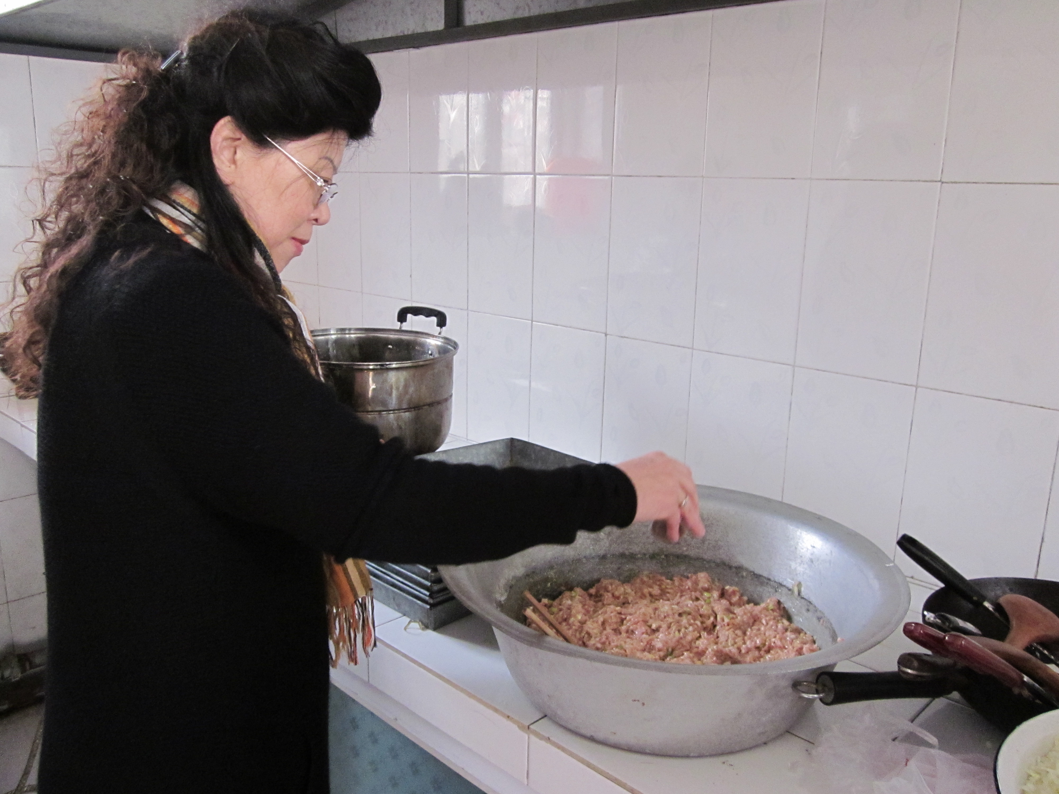 陈翠珍、沈萍两位教授正在合作为饺子馅调味