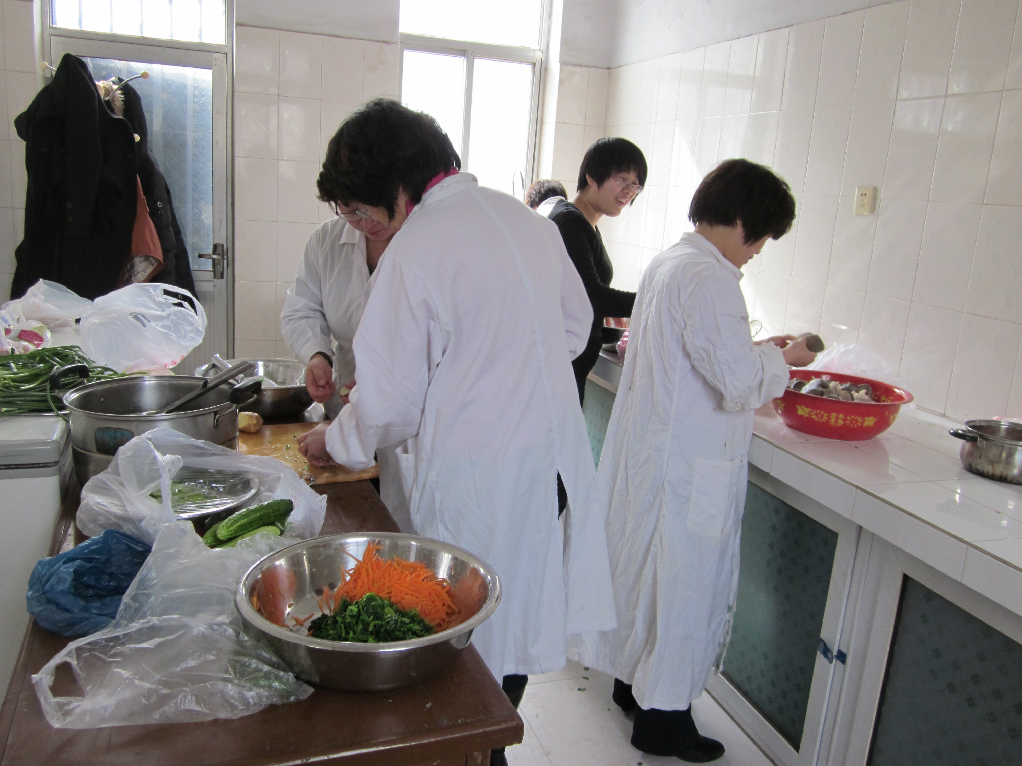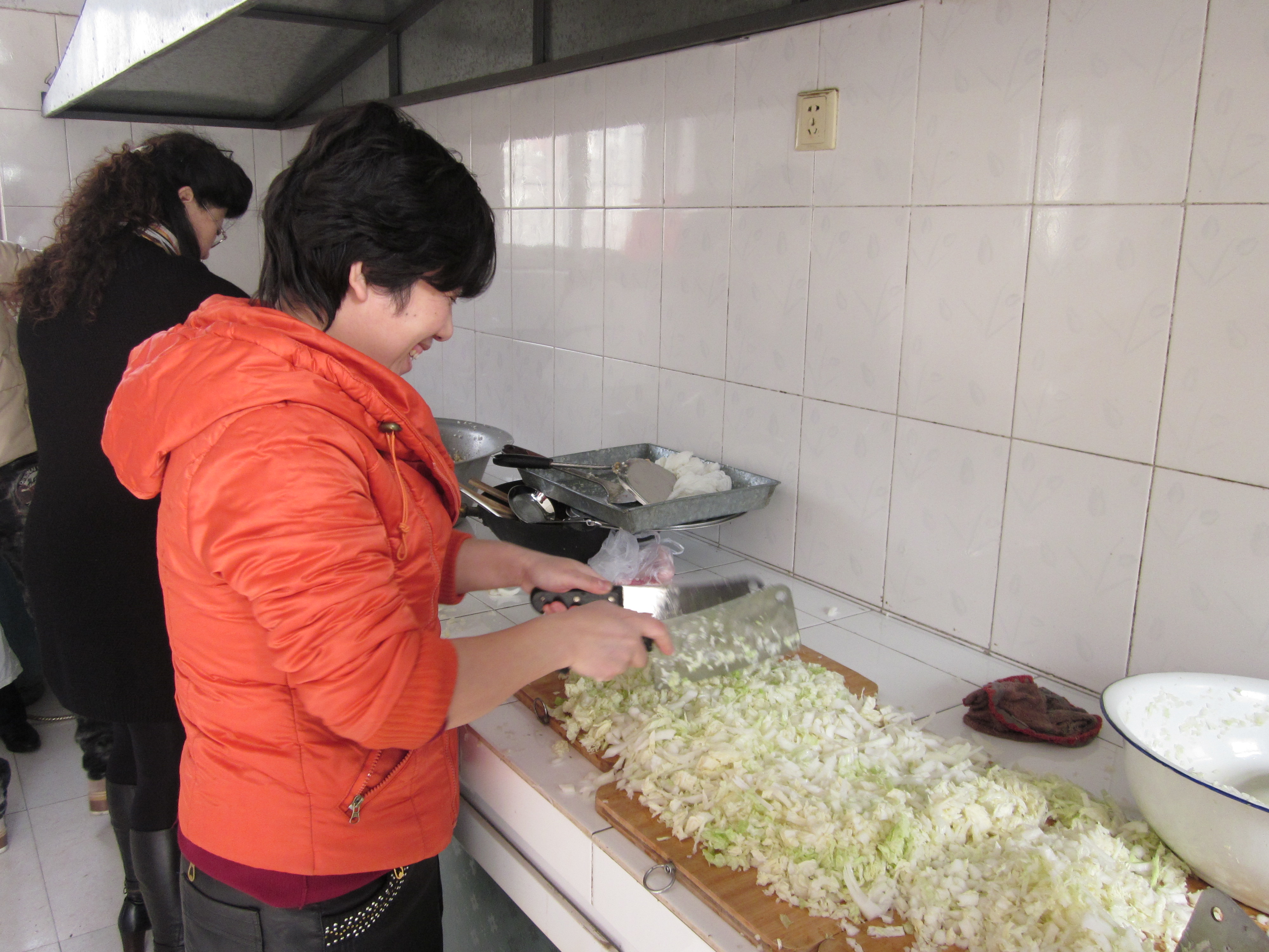 左右没课的女教师自发组成小组开始为中午的厨艺大赛兼品尝盛宴做准备,大家齐动手和面、洗菜、