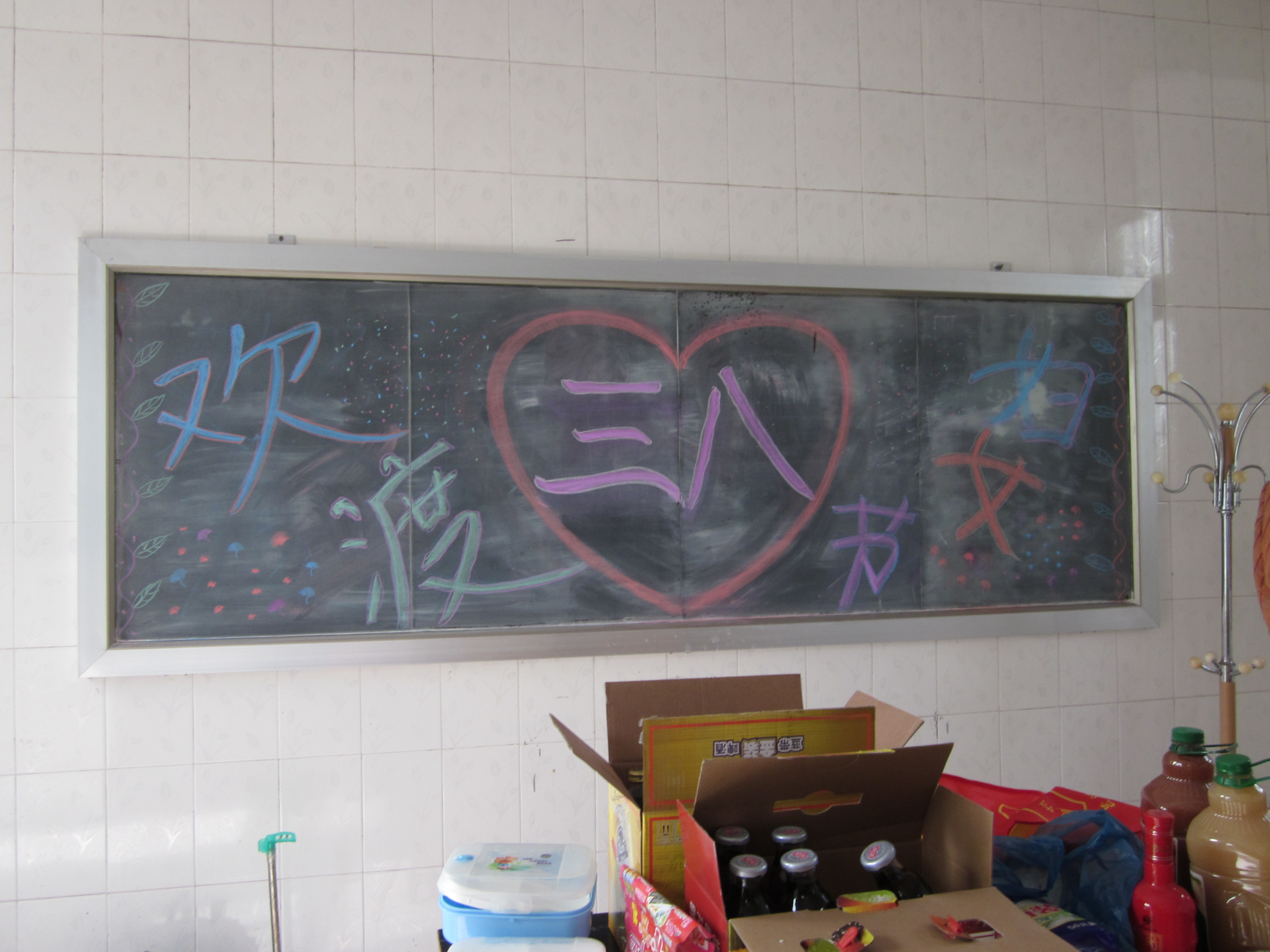 12点38分一道道色香味俱全的菜肴做好,端上饭桌,大家一齐举杯庆祝三八妇女节。老师们围坐