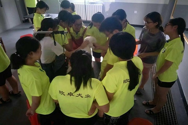 “奇缘宠物队”与“彩虹糖”实践小队一同来到天津欧卓犬业,对目前国内的宠物市场行情进行了学习并对宠物狗的美容、饲喂进行了亲手操作。